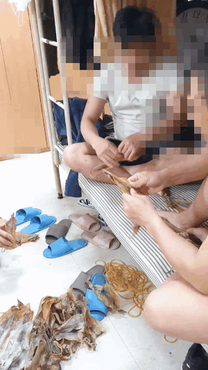 영상에서 남성은 다른 외국인 노동자들과 함께 마른오징어를 맨손과 맨발로 납작하게 피고 있었다.