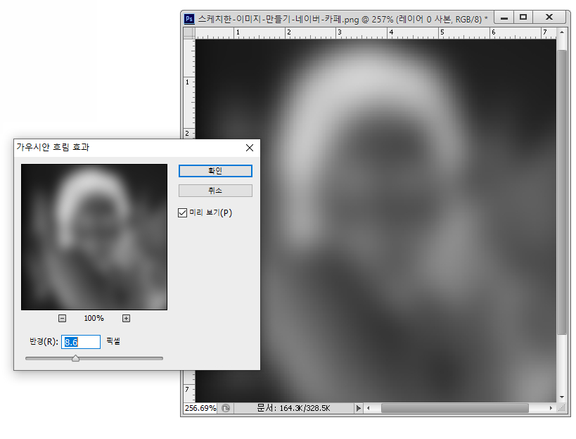 4.복사된 레이어가 선택된 상태에서 필터 > 흐림효과 > 가우시안 흐림효과(반경값 8.6)를 적용해주자.