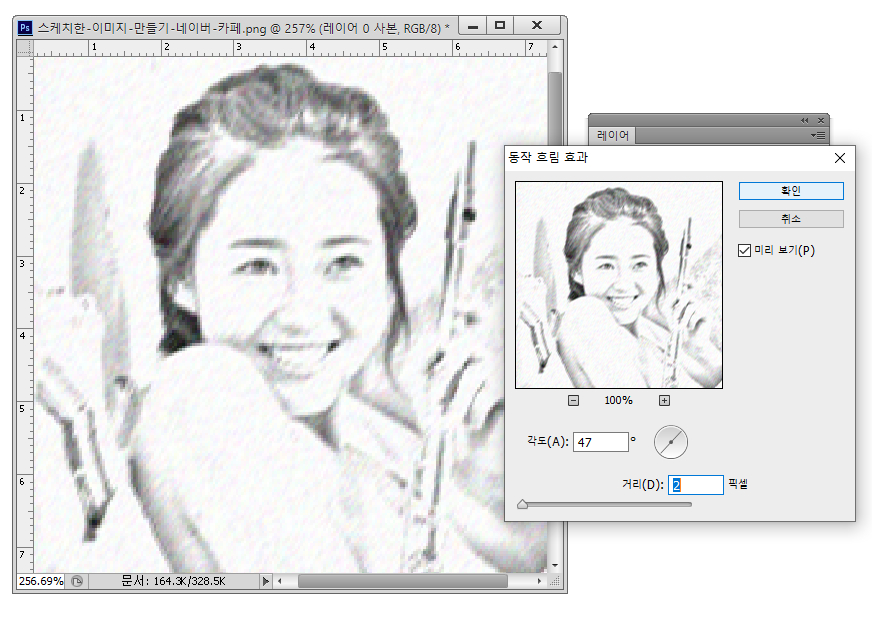 7.필터 > 흐림효과 > 동작흐림효과를 그림과 같이 적용해준다.