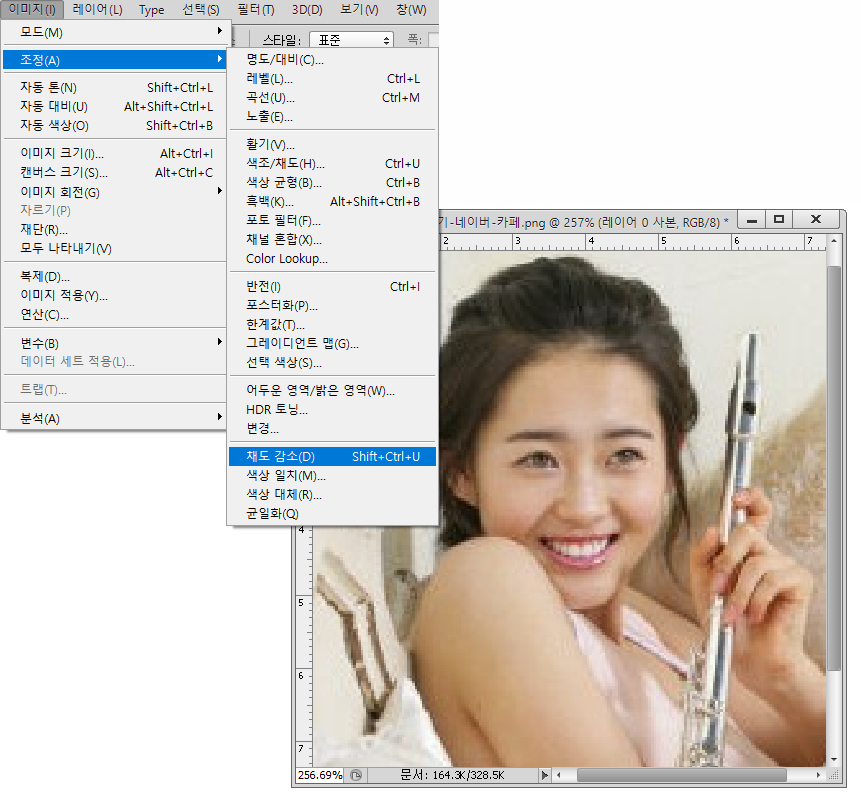 2.원본,복사레이어 모두 이미지 > 조정 > 채도감소(D) 해서 흑백이미지로 만들어 준다.
