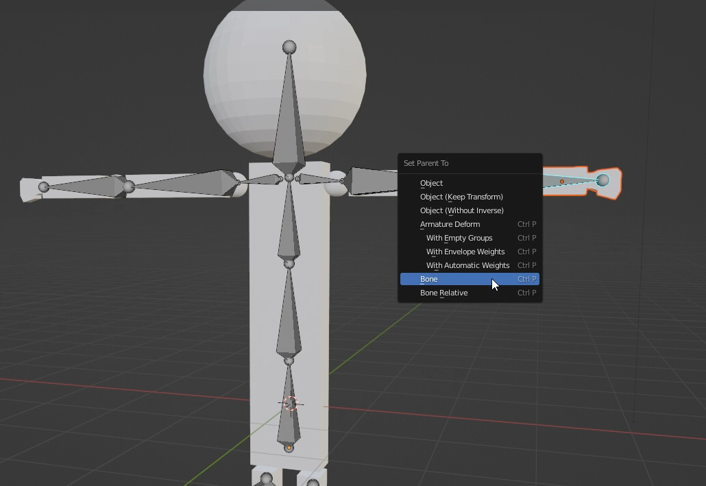 2. 오브젝트를 먼저 누르고 뼈를 선택후에 ctrl+P > Bone 선택 (뼈부터 선택하면 전체가 선택되어 버린다.)