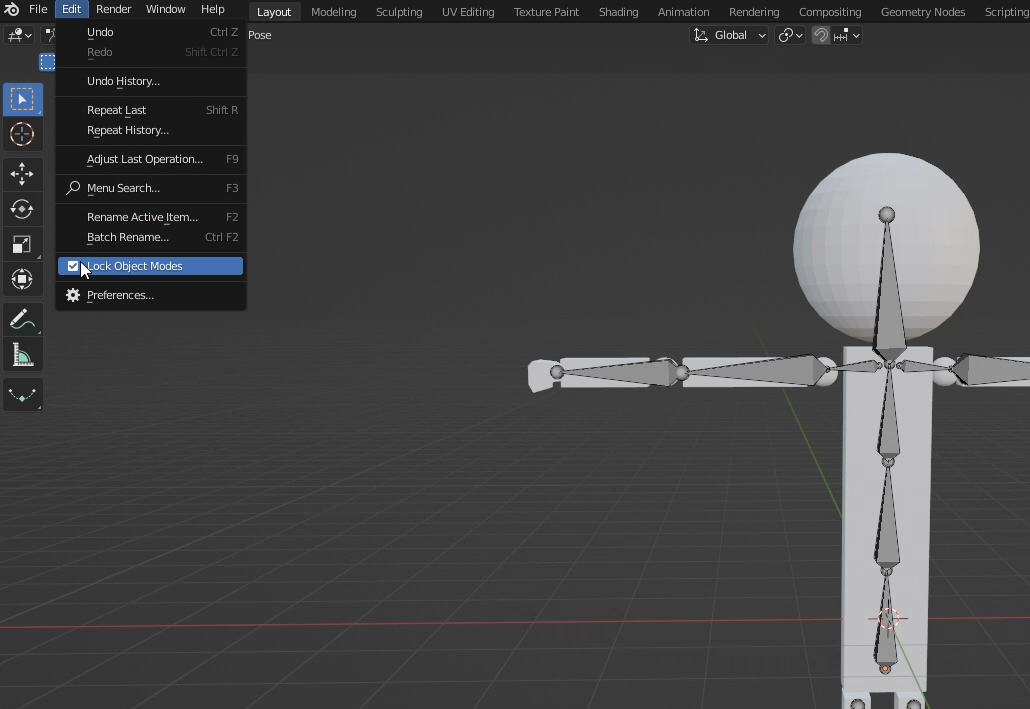1. 분리되어 있는 뼈와 살을 합쳐주자. 왼쪽상단 Object Mod > Pose Mod 로 들어간다.