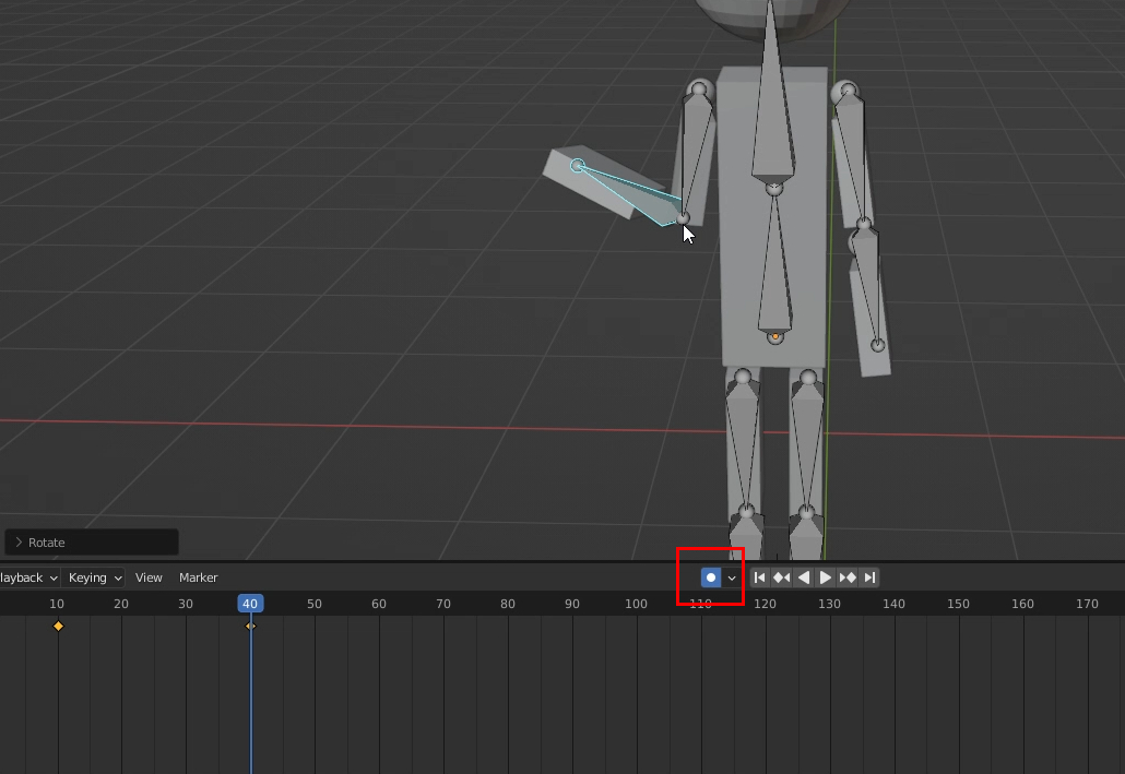 Auto Keying을 누르고 뼈를 움직이면 키프레임이 자동으로 생성된다. 간단하게 40프레임 정도에 팔을 움직여봤다.