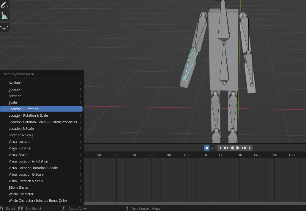 1. 하단 타임라인에서 시작부분 선택 > 왼쪽상단 pise mode > 뼈를 선택후에 > 마우스 우클릭(단축키 i) > Location , Rotation & Scale선택