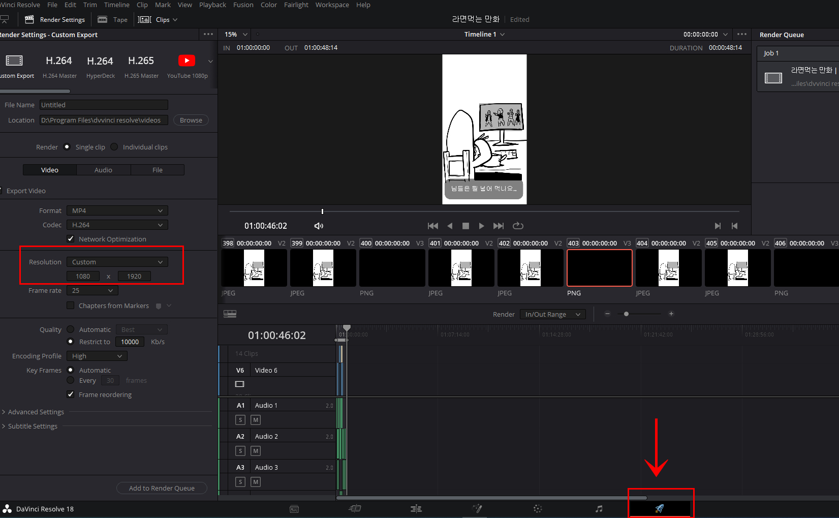 5. 하단 deliver > custom export, 1080x1920 으로 해주면 끝