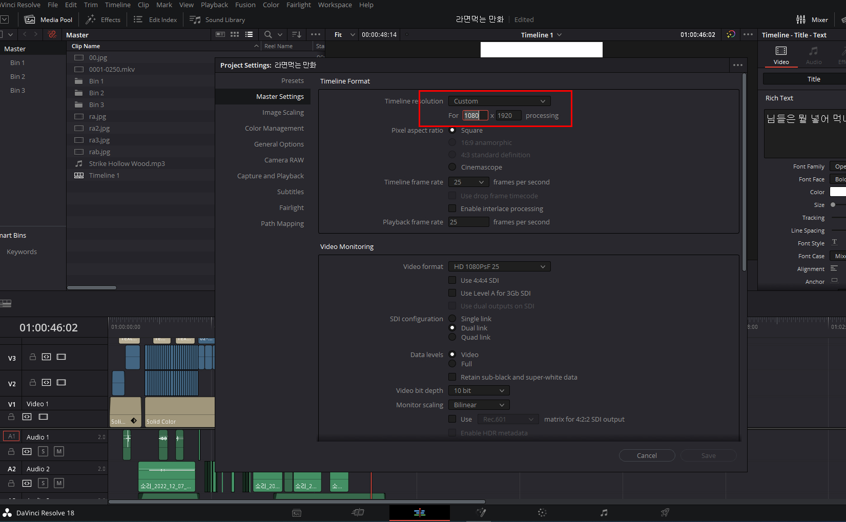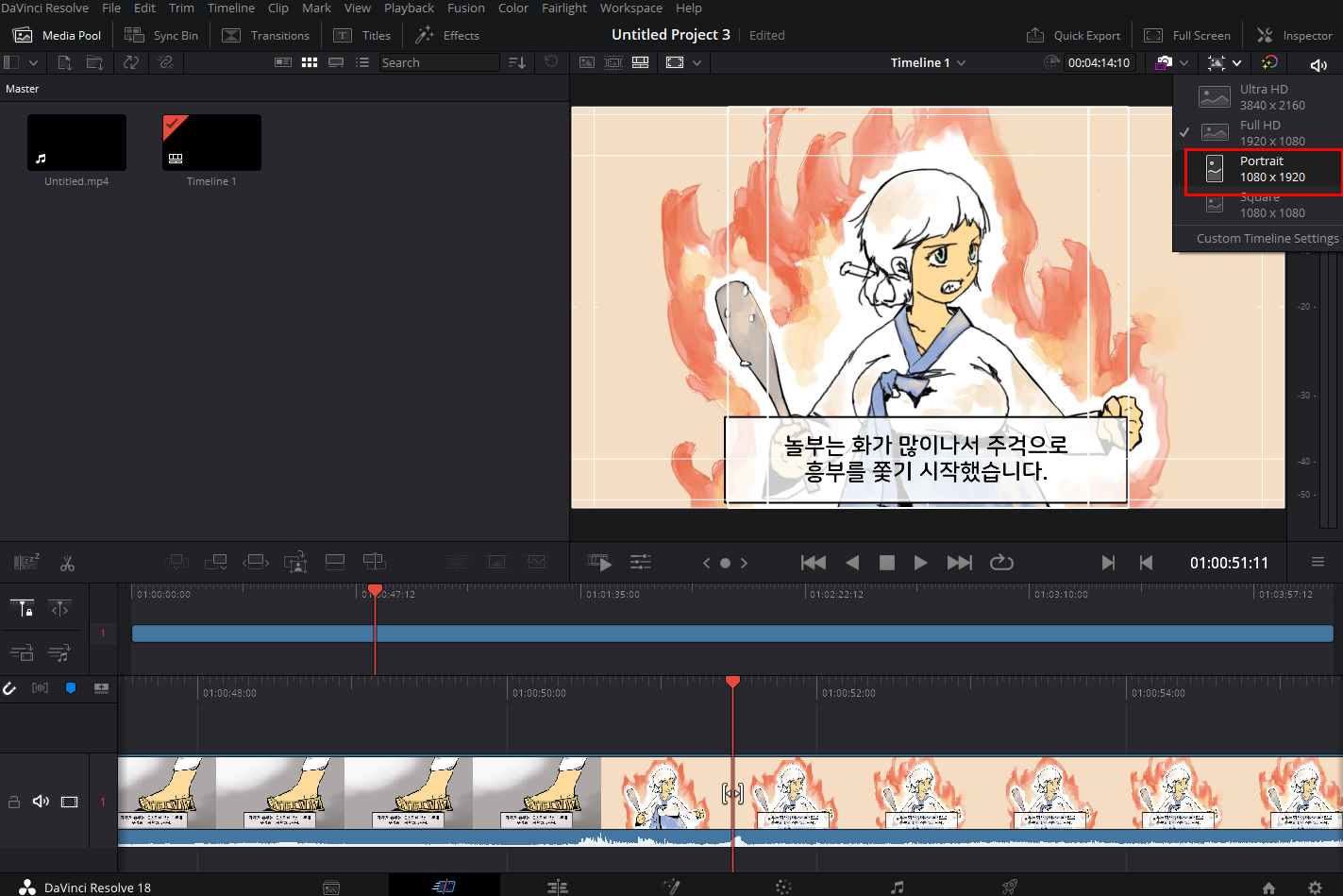 4. File > project settings > 그림처럼 Timeline resolution 항목에 custom, 1080x1920 으로