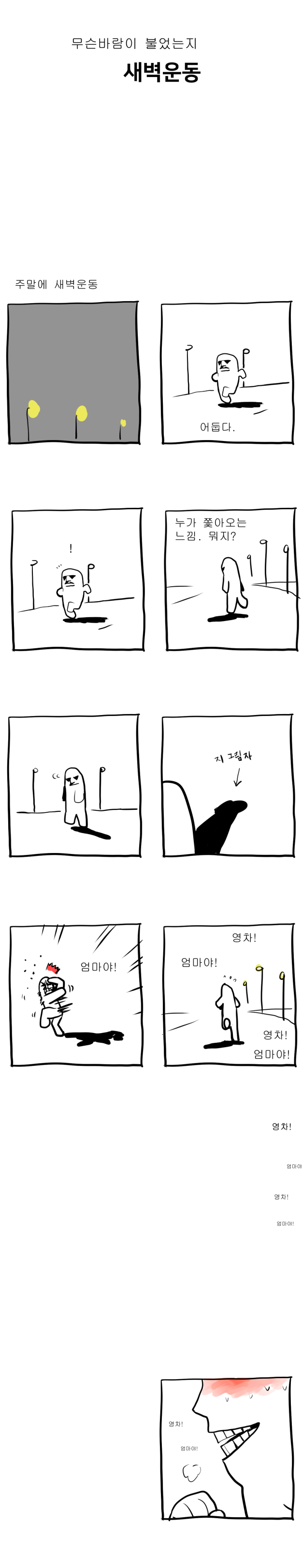 소스라치게 놀라서 한번 그려본 만화. 자기 그림자에 놀라본 사람