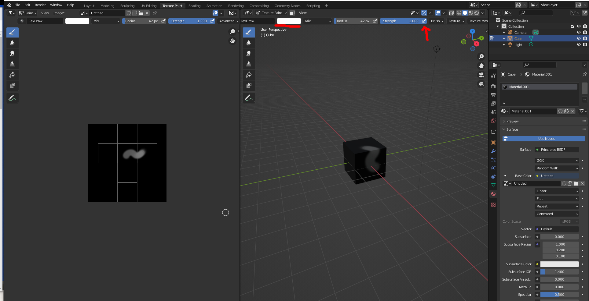 화살표 부분쪽 radius, strength를 활성화하면 사이즈나 필압사용 가능,