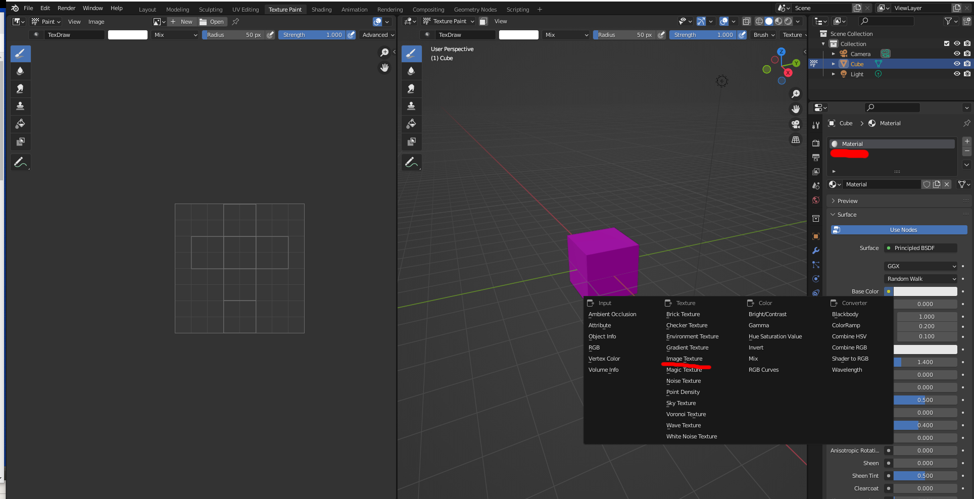 2. 우측의 Metrial properties > add a new Metrial > base color를 image texture로