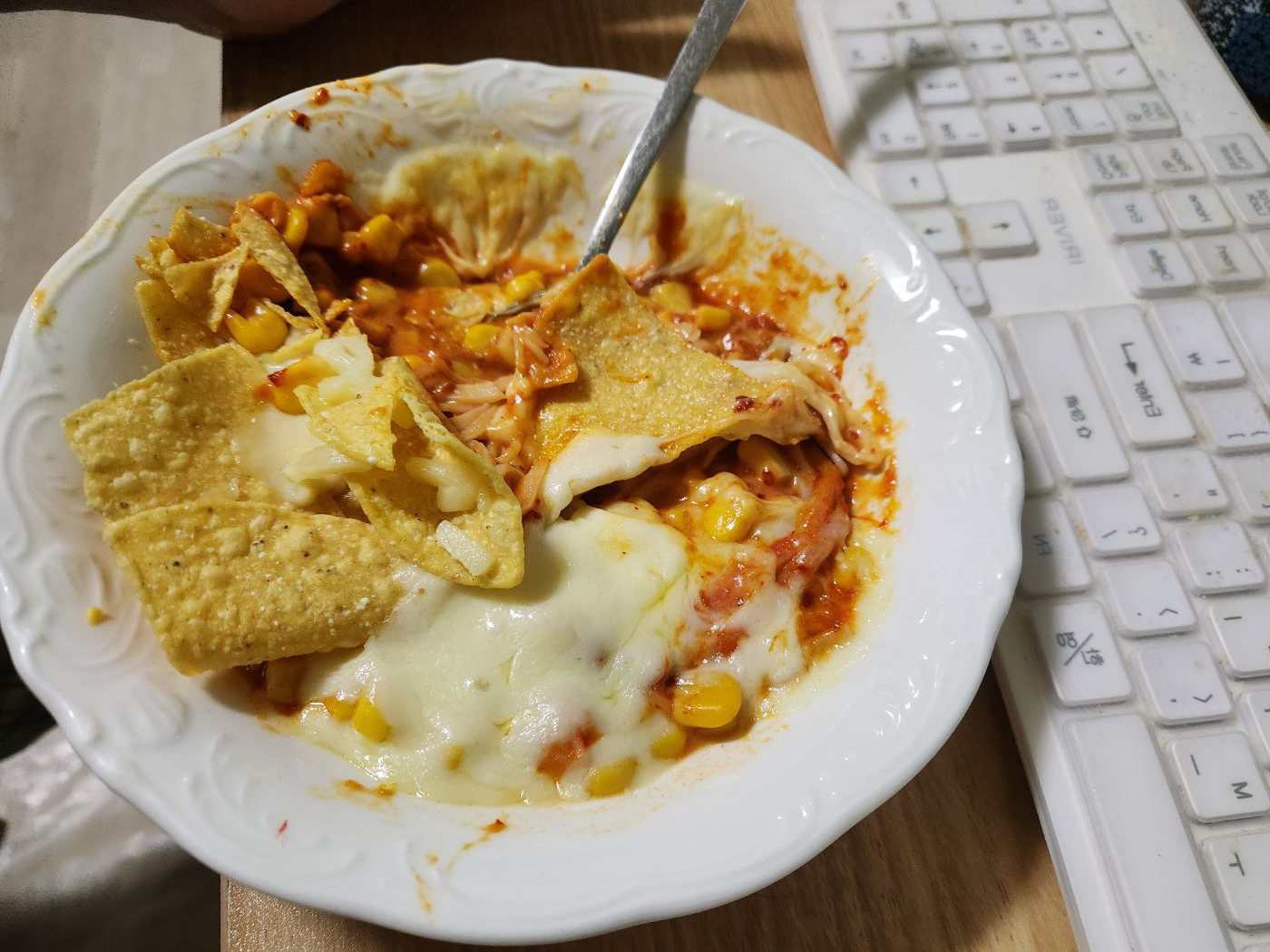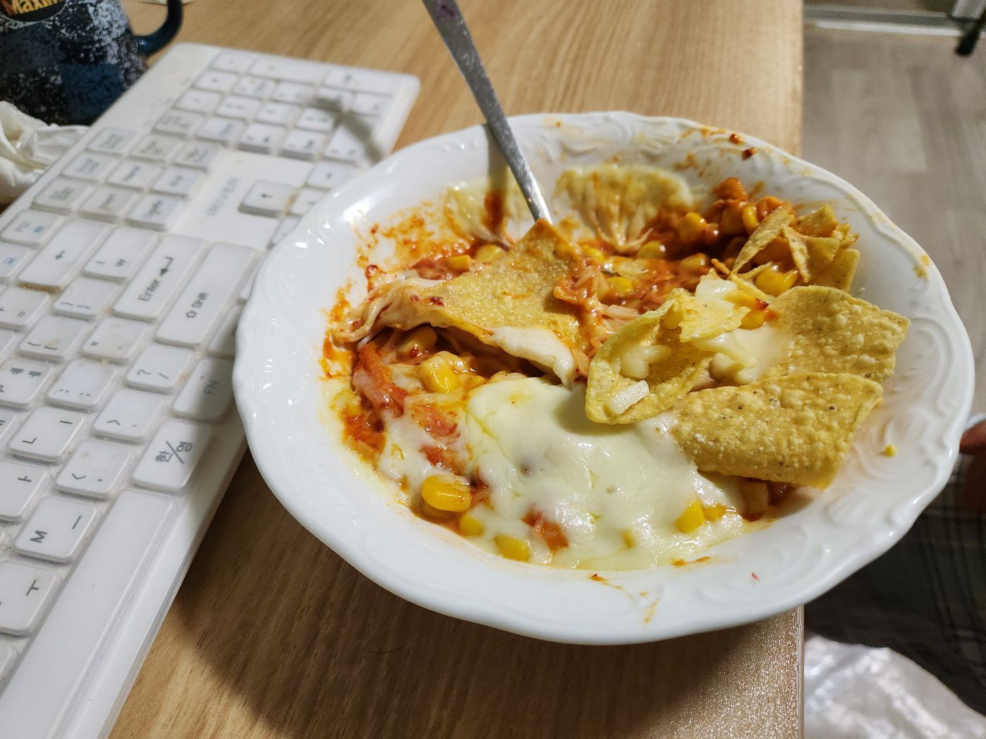 괜찮은데? 치즈. 맛살, 콘을 나쵸칩으로 뜸뿍떠서 바삭 고소하게 허겁지겁 먹었다.
