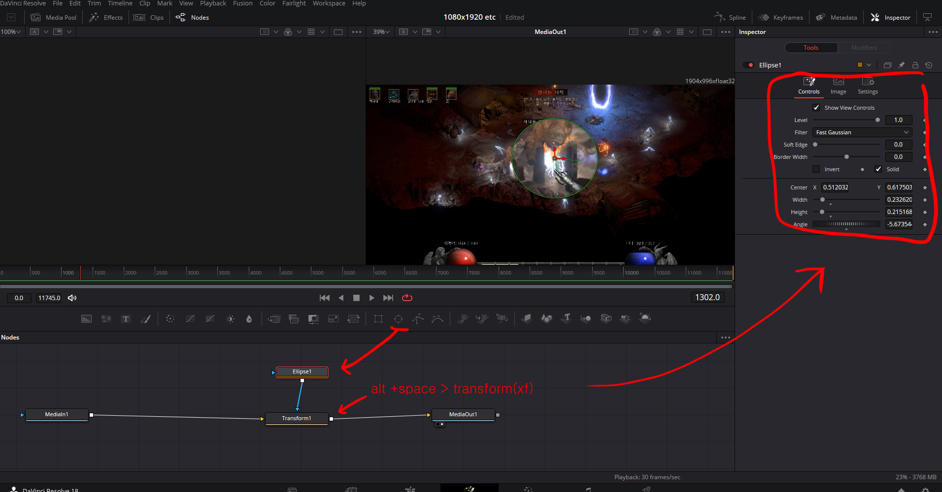 2. 메뉴바에서 원을 하나 만들어주고 > 빈공간에 ctrl+space > transform을 만들어서 그림과 같이 연결