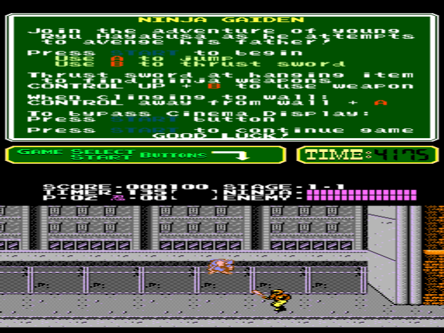 테크모에서 패미컴 시절 내놓은 작품들에 붙은 테크모 시어터 시리즈의 두 번째 작품. 초기작인 만큼 시스템도 미완성이라서 BGM도 대체로 크게 어필하지 못했다지만 이건 초대작이라서 그런 거고, 일본에서도 꽤 좋은 평을 받고 있으며 북미에서는 1편부터 음악이 전설급으로 대우받는다. 사실 닌자 용검전 시리즈 통틀어서 가장 많이 리믹스되는것도 1편의 음악. 제임스 롤프가 AVGN 영상에 2스테이지 파트 2 테마를 자주 삽입해서 많이 알려져 있고, 4 스테이지의 두 번째 BGM이 좋은 편이다.