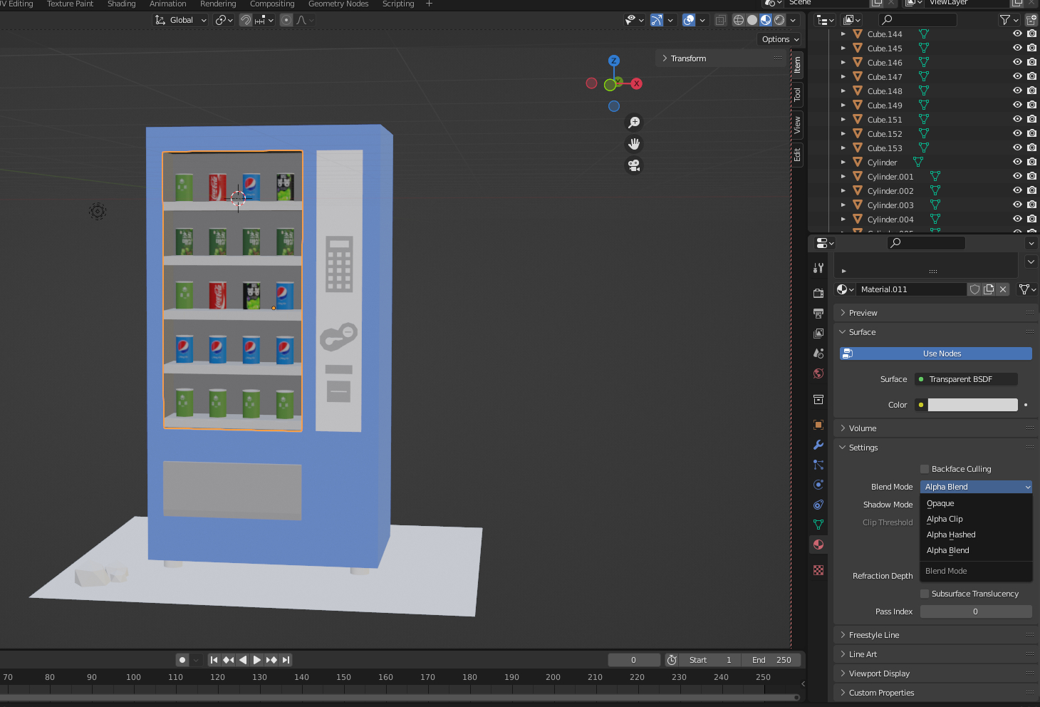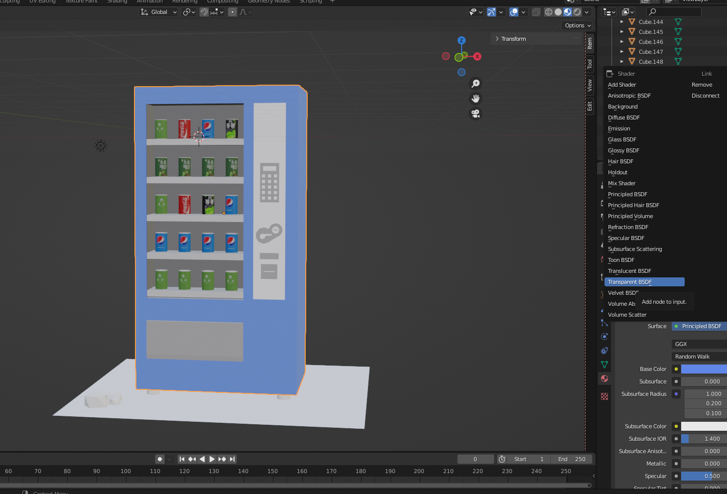 1. 작업할 오브젝트 선택 > matrial properties > new > surface를 transparent BSDF로 바꿔준다.