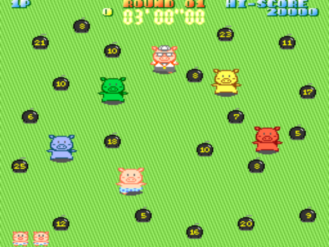 물방울 바지를 입은 돼지씨(보행하는 돼지)를 조작하여 시한폭탄을 던져 서로 동일화면내에 존재하는 다른 돼지를 모두 처치하고 다음 라운드로 이동하면 되는 고정 화면형 액션게임이다.