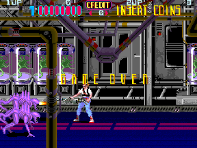 영화 '에일리언2'를 바탕으로한 아케이드 액션게임으로 1990년 3월에 발매되었고 당시 구경은 가끔했지만, 즐겨하지 않았던 게임이다. 게임캐릭터는 엘런 리플리(1p)와 해병대원 드웨인 힉스(2p)로 플레이가 가능하고, 캐릭터상 성능 차이는 없다.