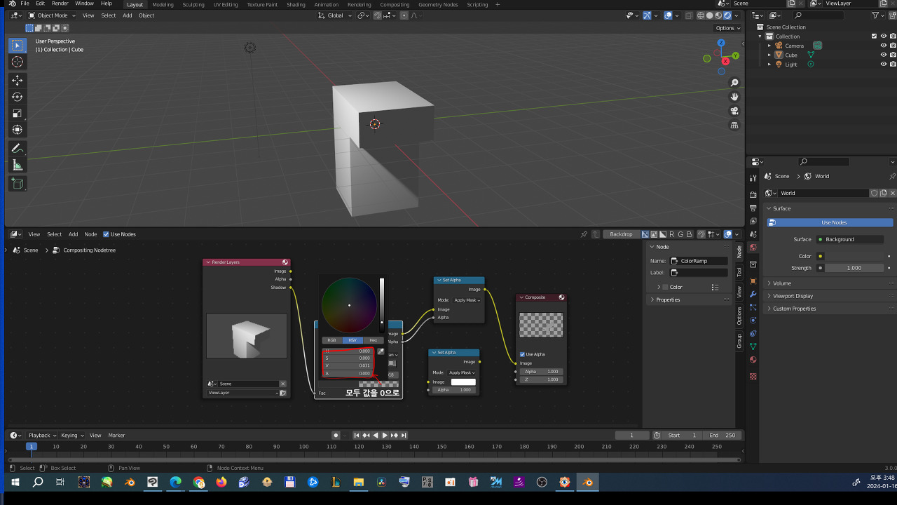 왼쪽상단 작업창 compositor 열기 > compositor 작업창 use nodes체크 > set alpha