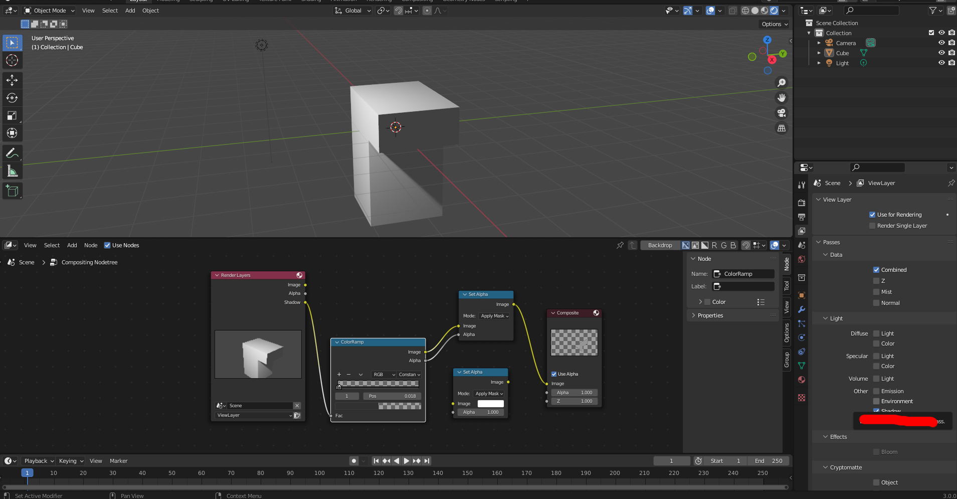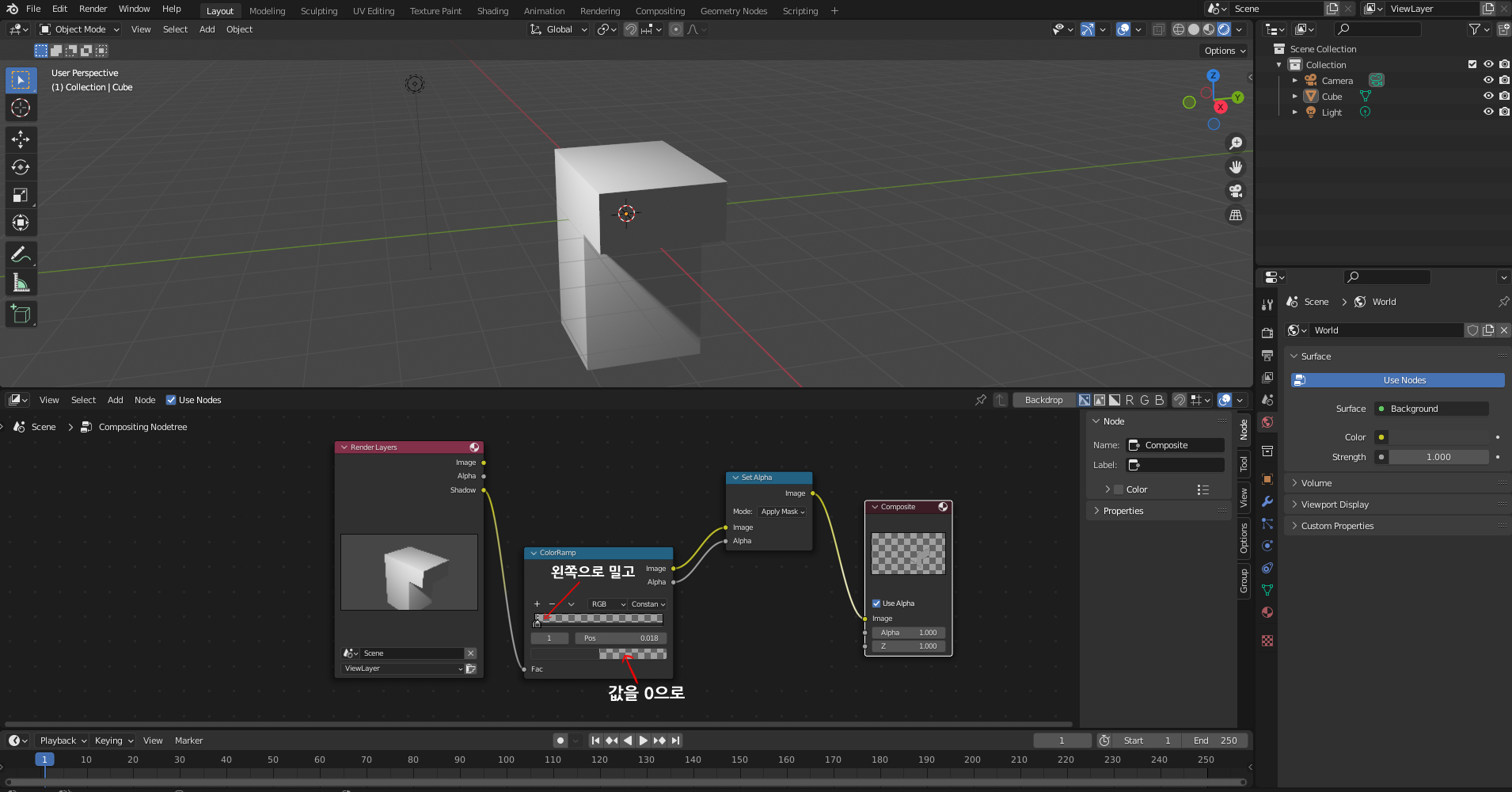 그림자에 배경을 포함해서 뽑을 거면 colorramp와 set alpha는 빼버려도 된다.