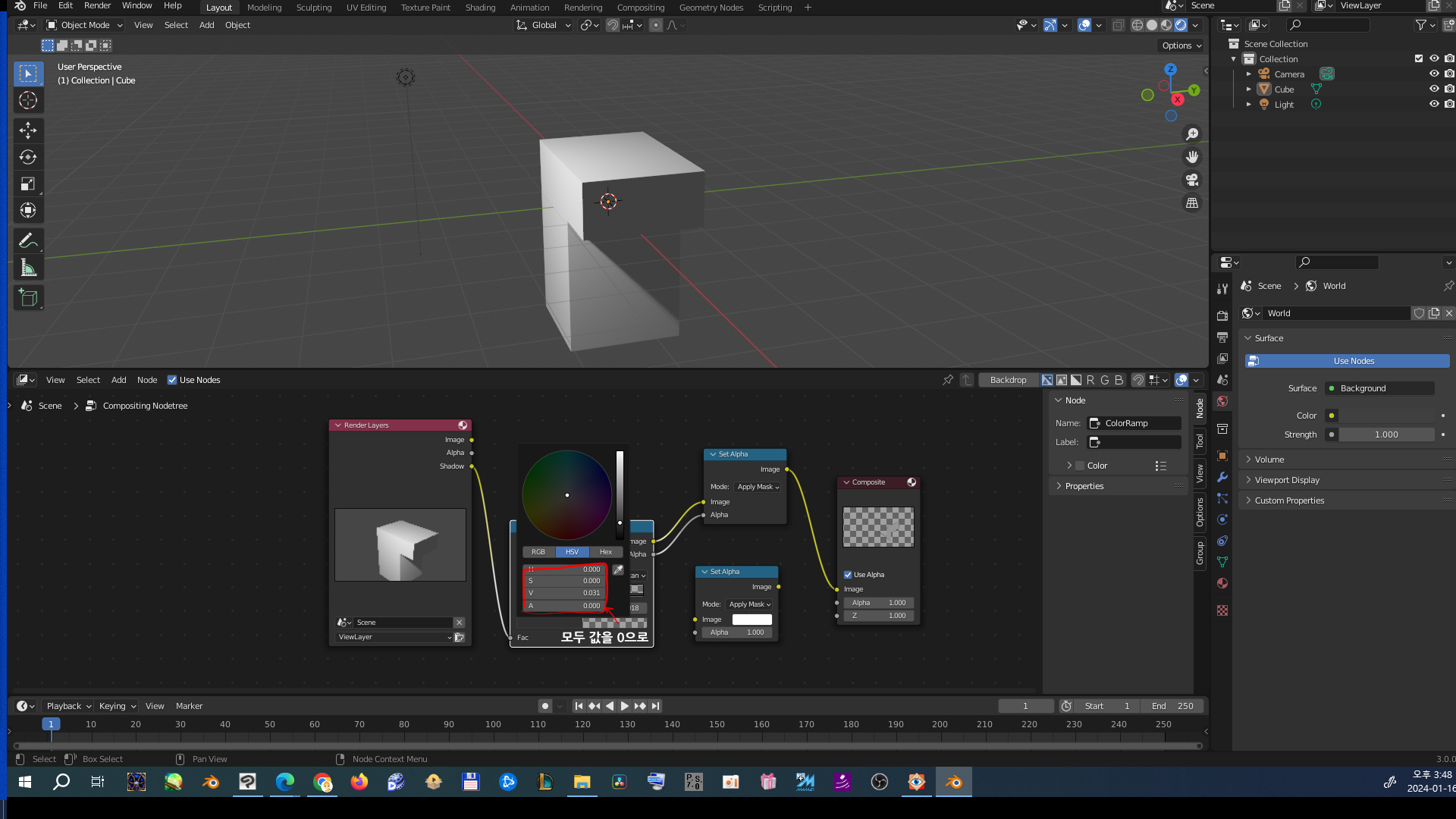 2. 왼쪽상단 작업창 compositor 열기 > compositor 작업창 use nodes체크 > 노드를 그림처럼