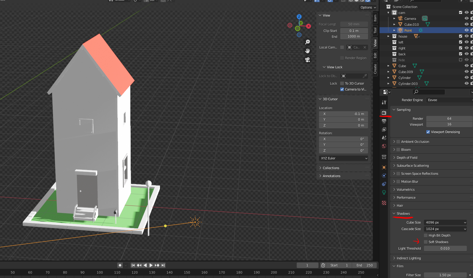 1. render properties > shadows > soft shadows 해제 ,cube size 4093